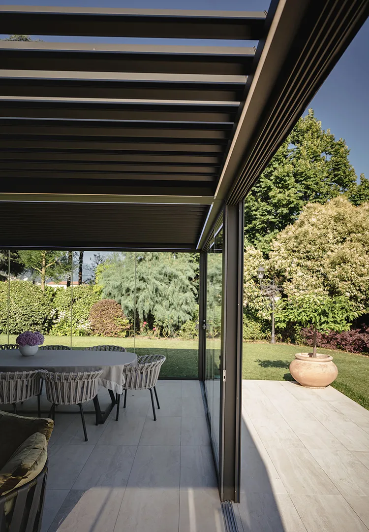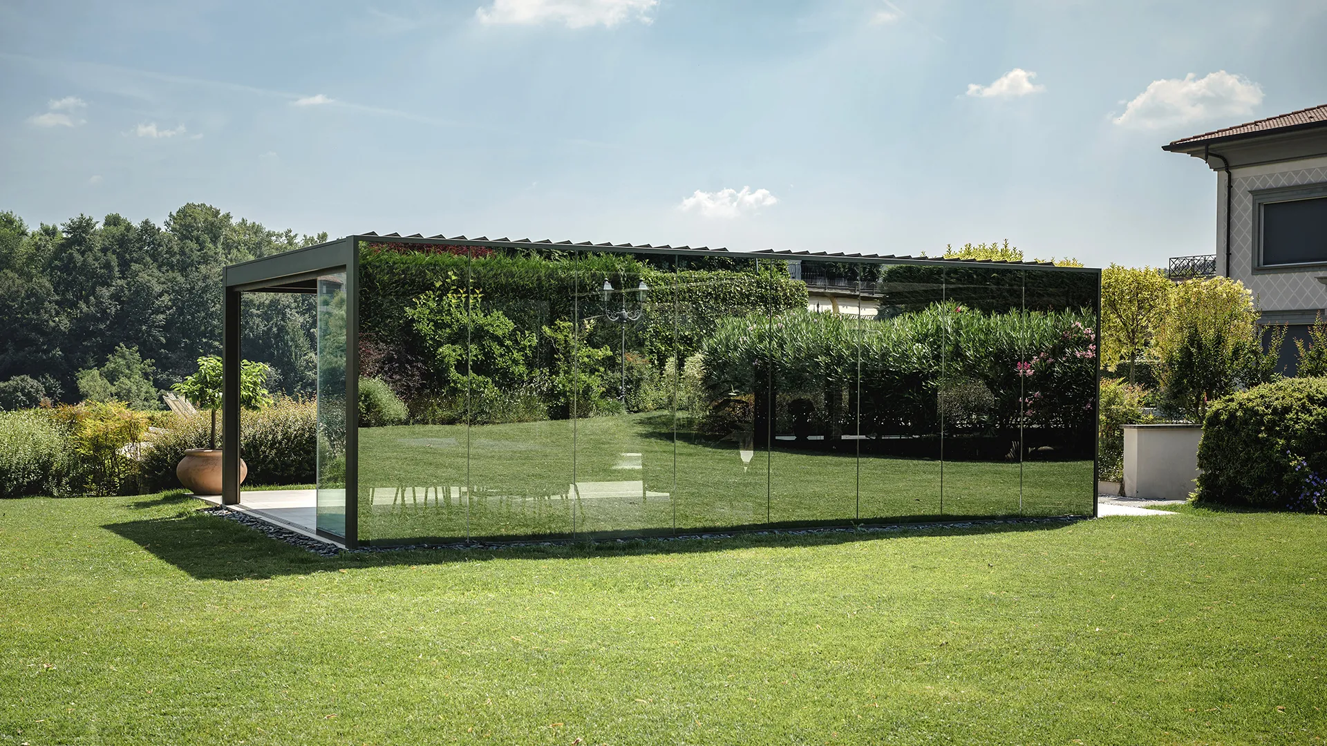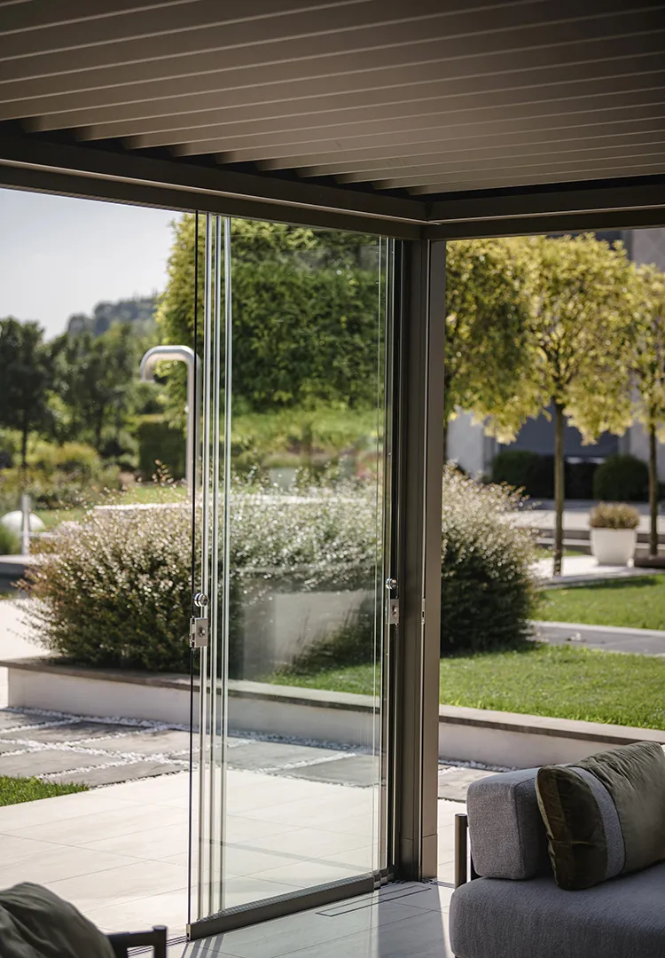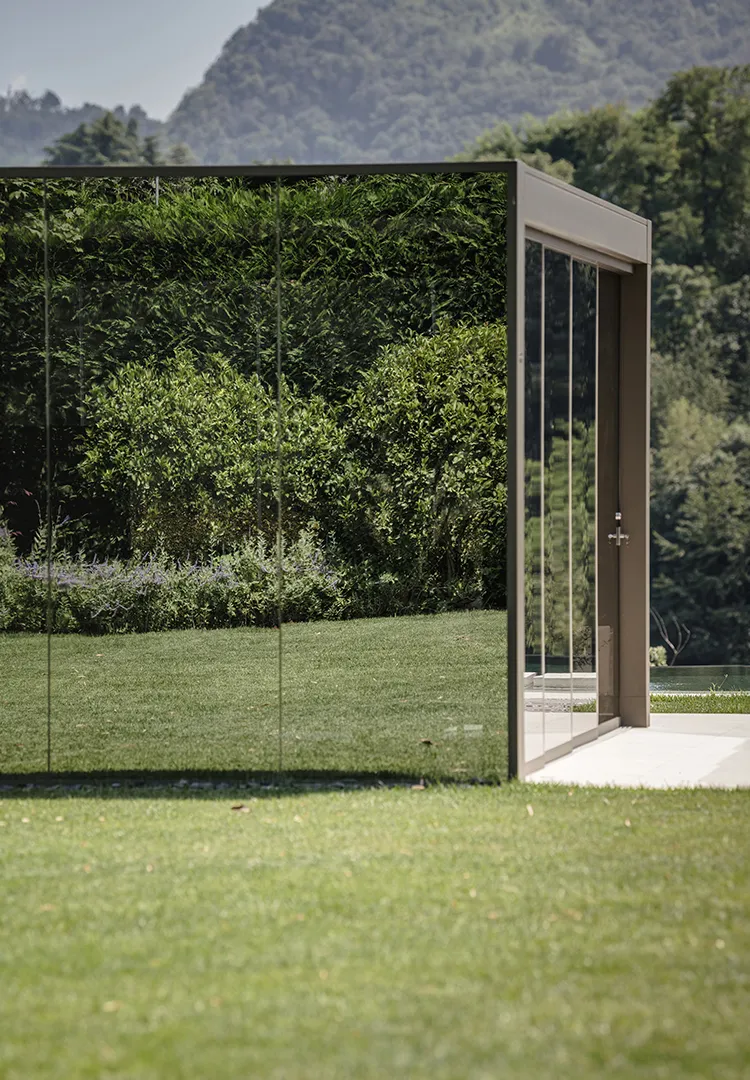 In questo intervento, la connessione con il paesaggio non passa solo dalla nuance verde oliva scelta per la struttura, ma trova il suo punto focale nella specchiatura delle pareti di Connect. Due i lati realizzati con vetrate Mirrored Glass, fisse e scorrevoli – rispettivamente quelli orientati verso la casa e l’ingresso della residenza – che riflettono la vegetazione presente nel giardino, integrando la pergola in modo discreto, quasi mimetico.