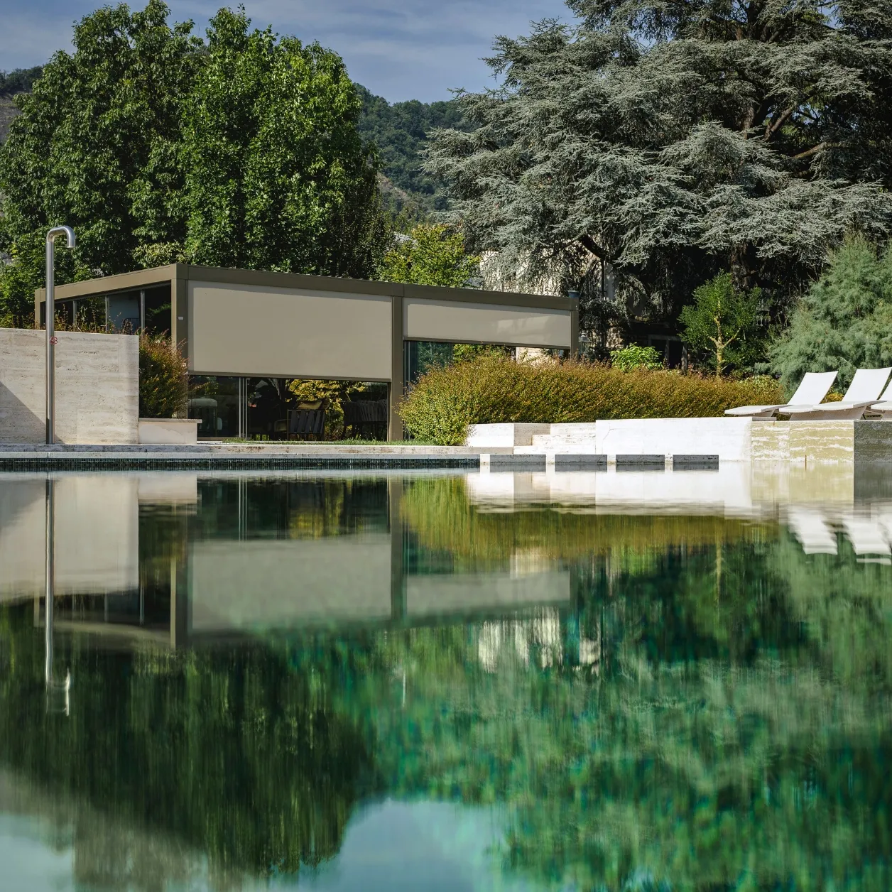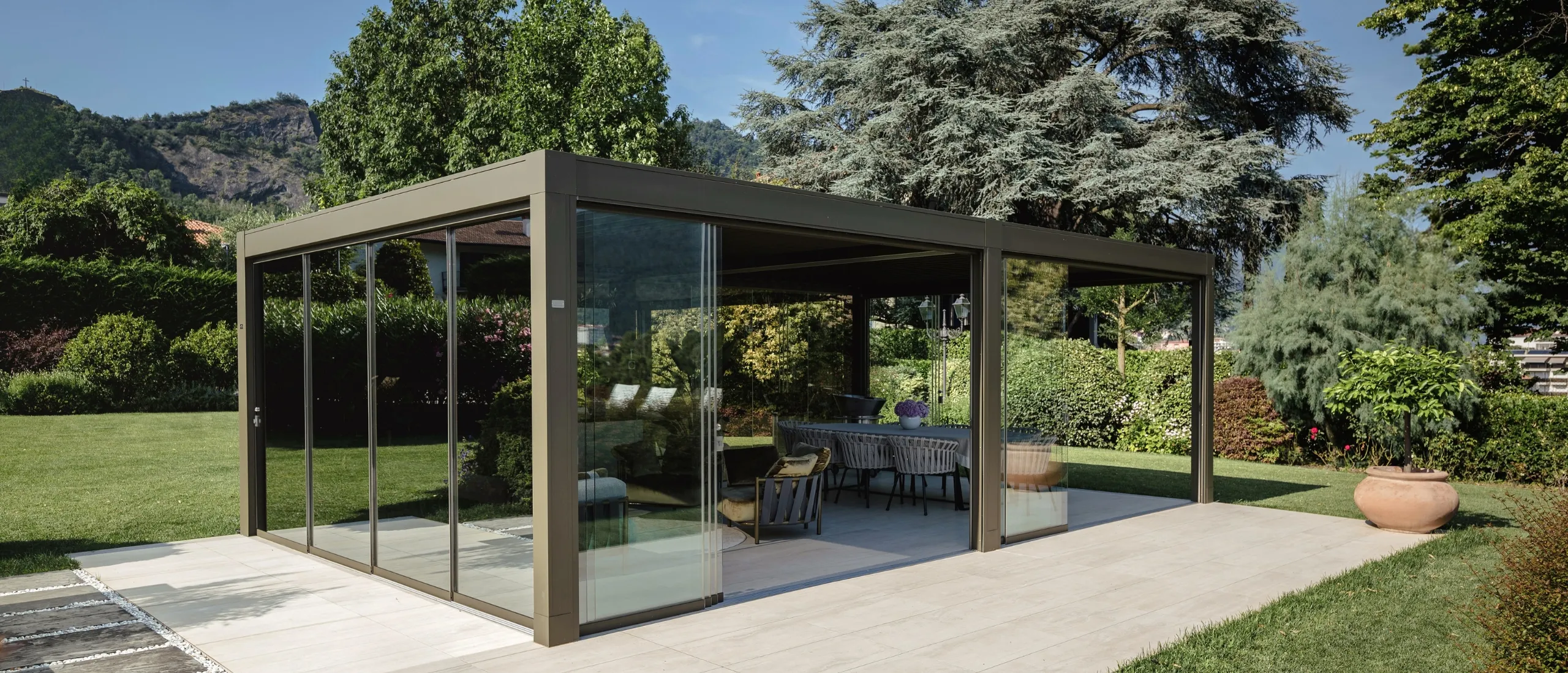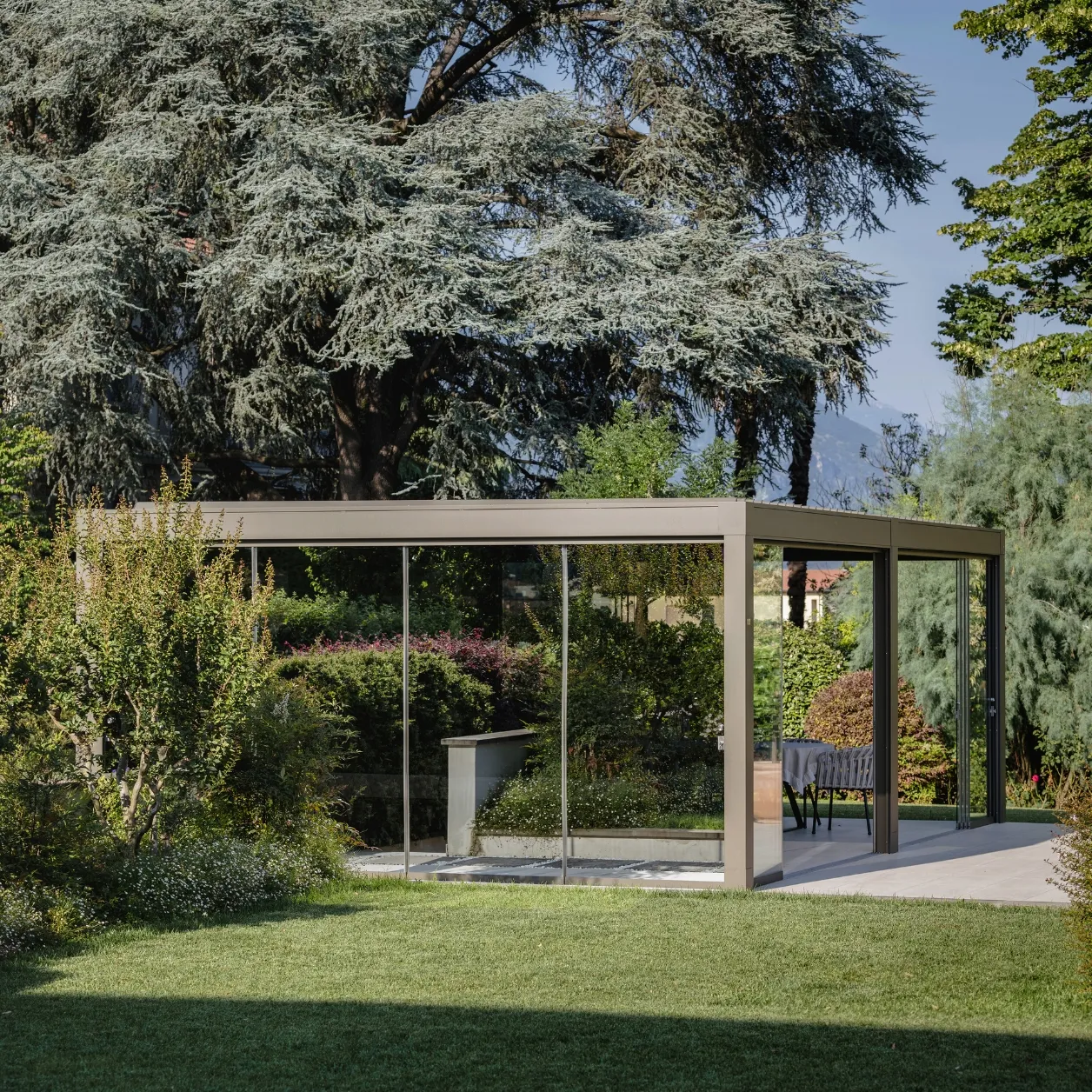 In questo intervento, la connessione con il paesaggio non passa solo dalla nuance verde oliva scelta per la struttura, ma trova il suo punto focale nella specchiatura delle pareti di Connect. Due i lati realizzati con vetrate Mirrored Glass, fisse e scorrevoli – rispettivamente quelli orientati verso la casa e l’ingresso della residenza – che riflettono la vegetazione presente nel giardino, integrando la pergola in modo discreto, quasi mimetico.