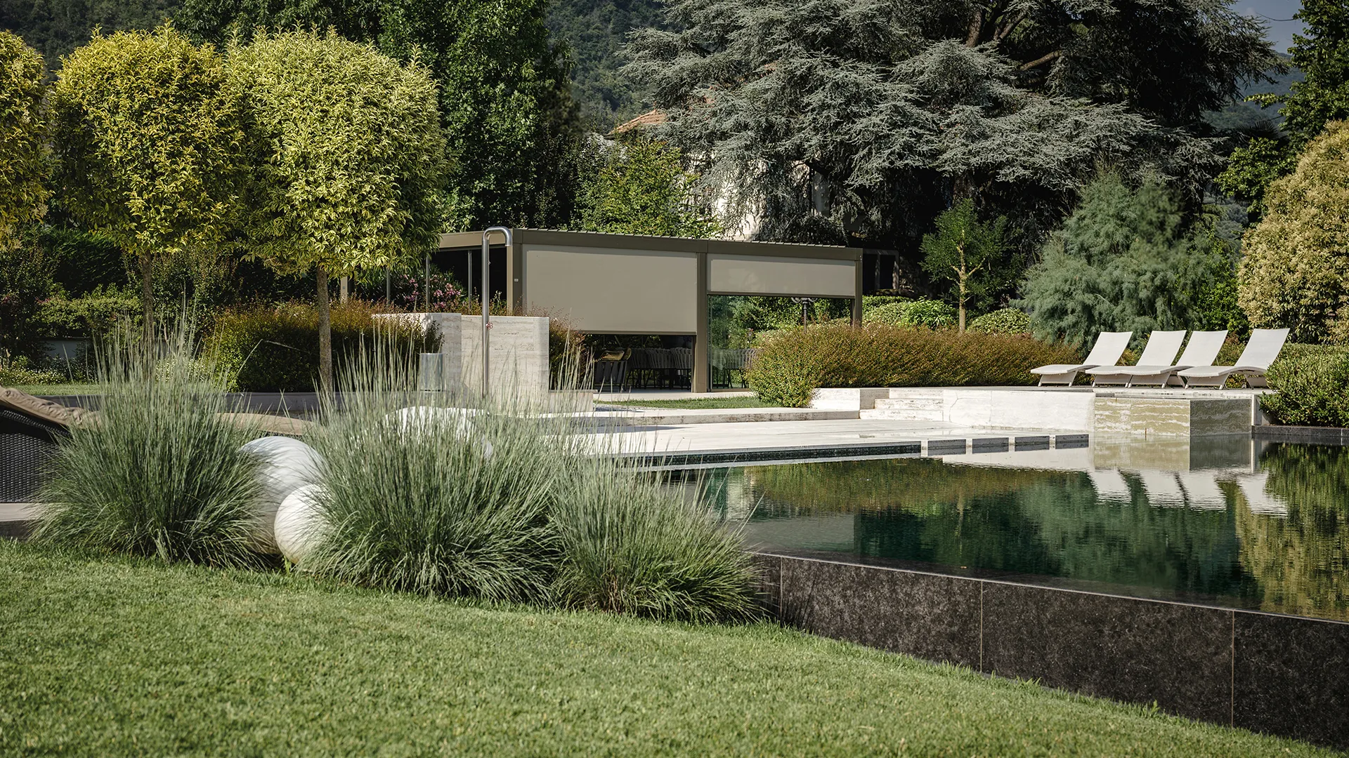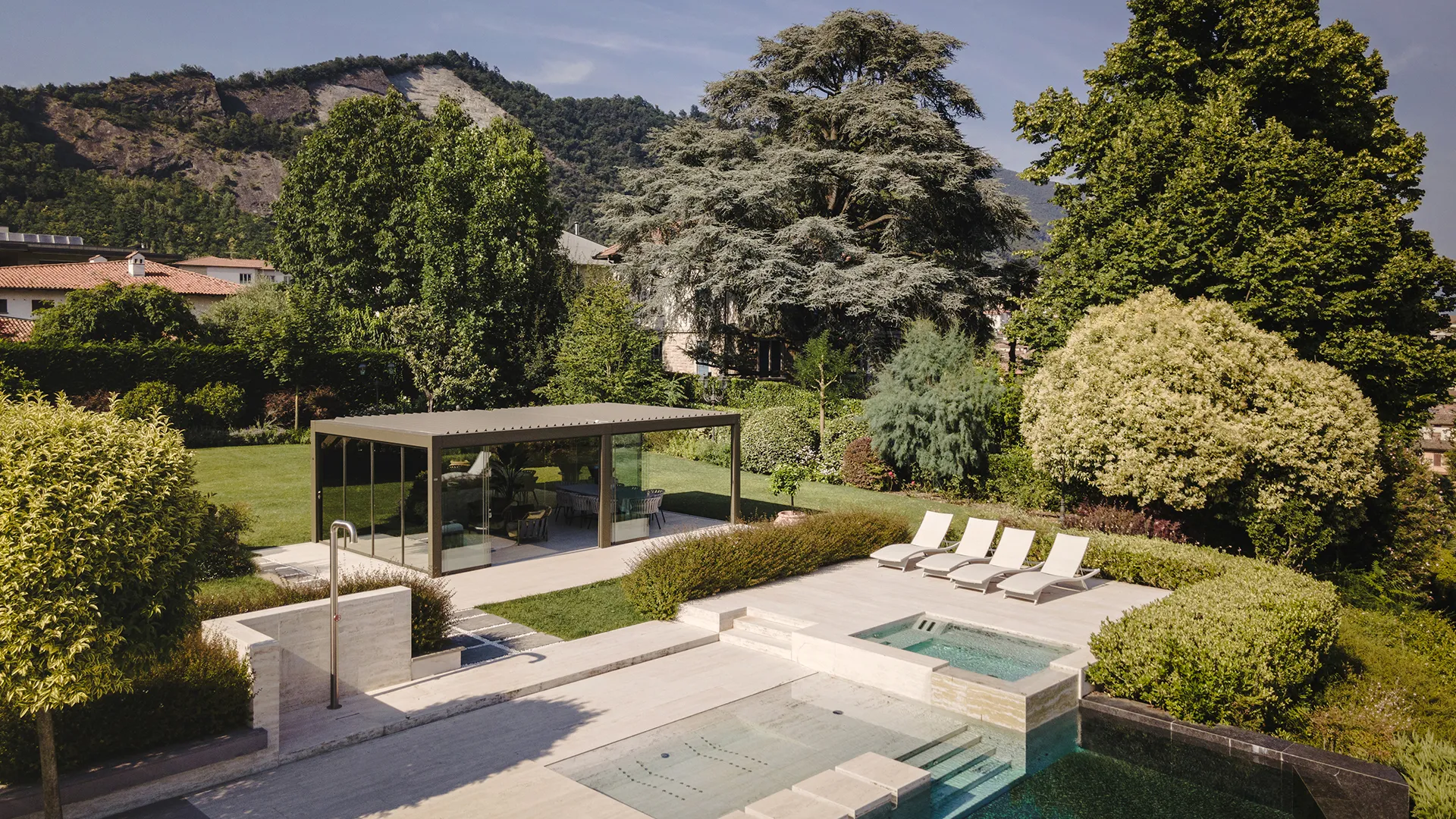 Per un’elegante residenza che domina il Lago d’Iseo, il progetto di un’oasi di leisure open air nasce dalla necessità di dare nuova funzione a un’area del giardino non ancora vissuta appieno. Il progetto della villa prevedeva infatti, sin dall’inizio, una struttura capace di ospitare momenti di relax, convivialità e tempo libero in un punto strategico della proprietà: più vicino alla piscina rispetto all’esistente portico della dimora, e con una vista ininterrotta sul lago.