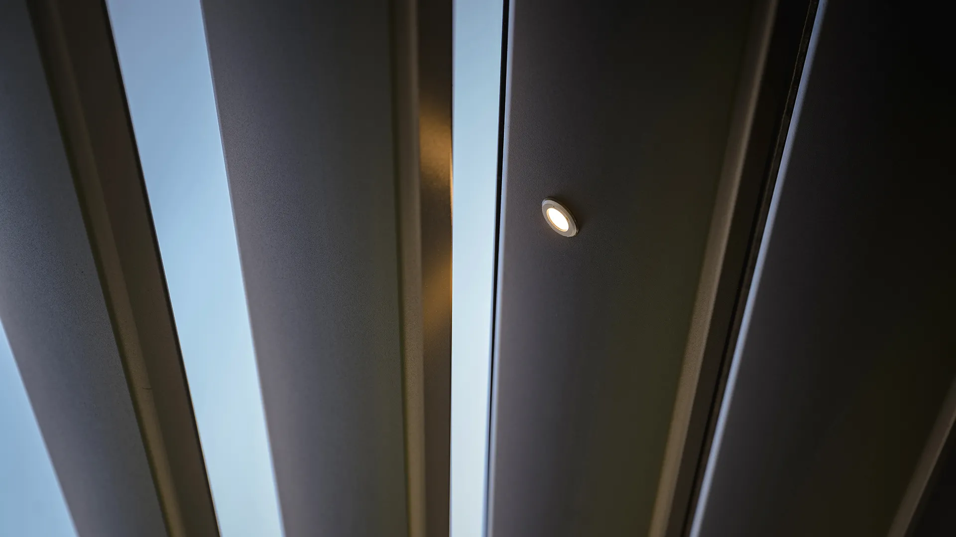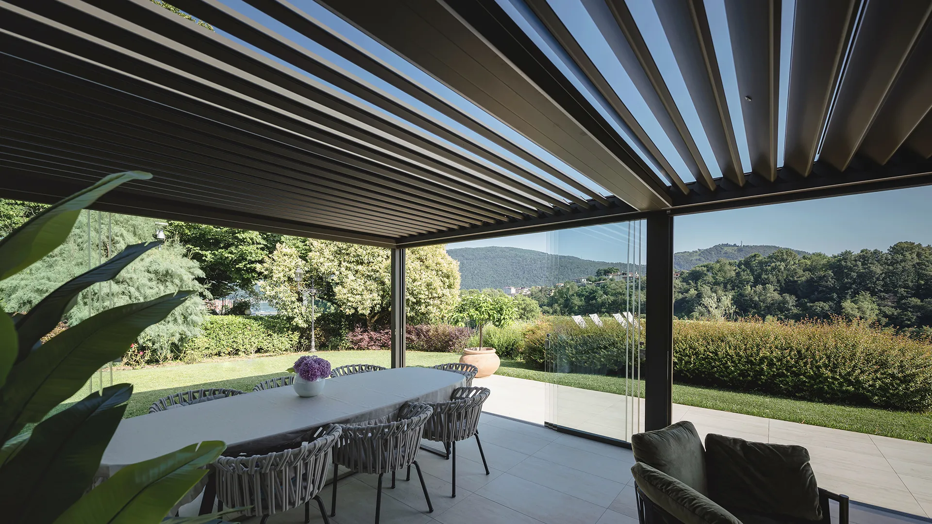 La pergola, con dimensioni di 5 x 8 metri, è dotata di lame frangisole orientabili fino a 140 gradi, che permettono di regolare luce naturale e ventilazione per ottenere sempre le migliori condizioni di comfort climatico. L’esposizione a sud ha richiesto l’inserimento di tende verticali Raso a completa scomparsa, pensate per garantire ombreggiatura senza compromettere la visuale. L’intero sistema è poi gestito da un telecomando a nove canali e sensori pioggia per una protezione automatica in caso di maltempo. Di sera, invece, l’ambiente è rischiarato dalla luce perimetrale dei LED Line RGB e da faretti Spot Light a luce bianca calda integrati nelle lame.