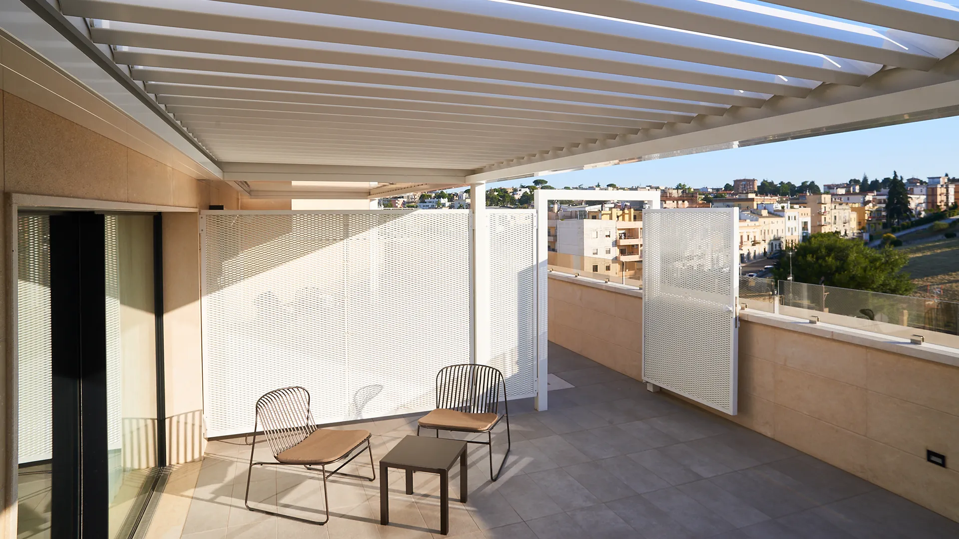 Il design leggero e discreto della pergola ha poi comportato un ulteriore beneficio, in quanto la sua volumetria ridotta e la possibilità di essere facilmente rimossa hanno permesso di rispondere in modo puntuale ai molti vincoli paesaggistici della zona. Anche la scelta del colore non è casuale: la brillante tonalità avorio, selezionata per Vision, esalta le cromie chiare e naturali della pietra utilizzata per la facciata. Un dettaglio estetico di grande pregio, che è anche un omaggio alla meraviglia dei Sassi di Matera, patrimonio dell’umanità UNESCO.