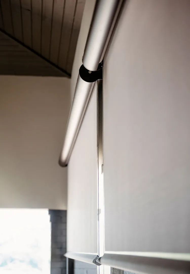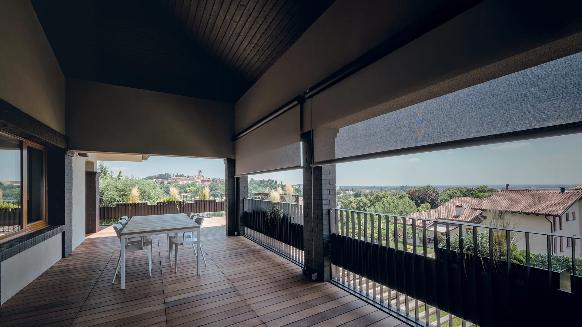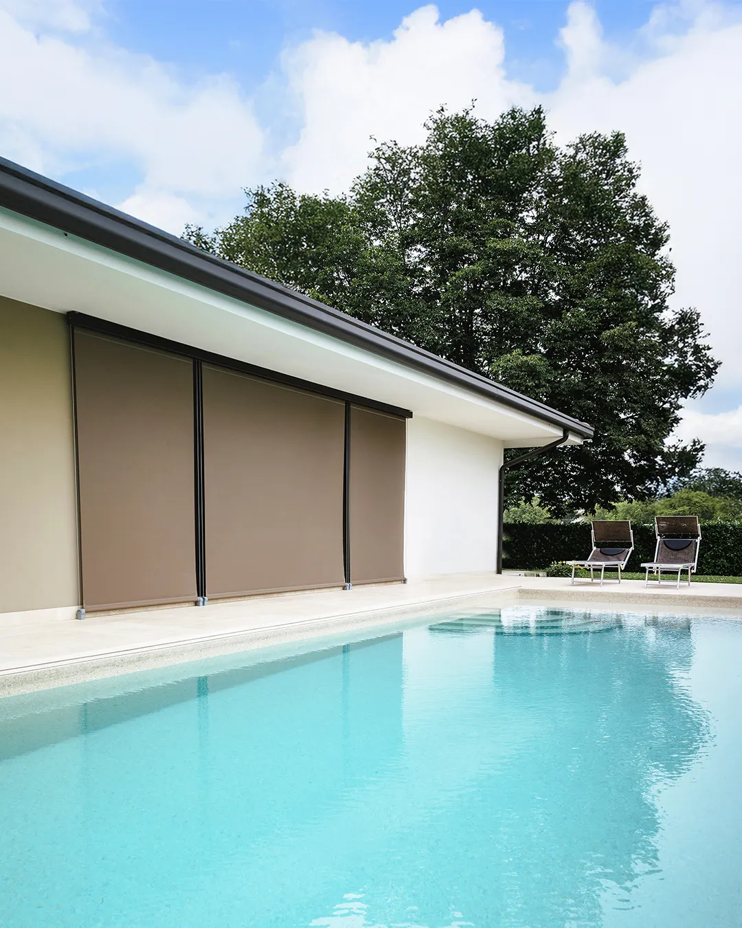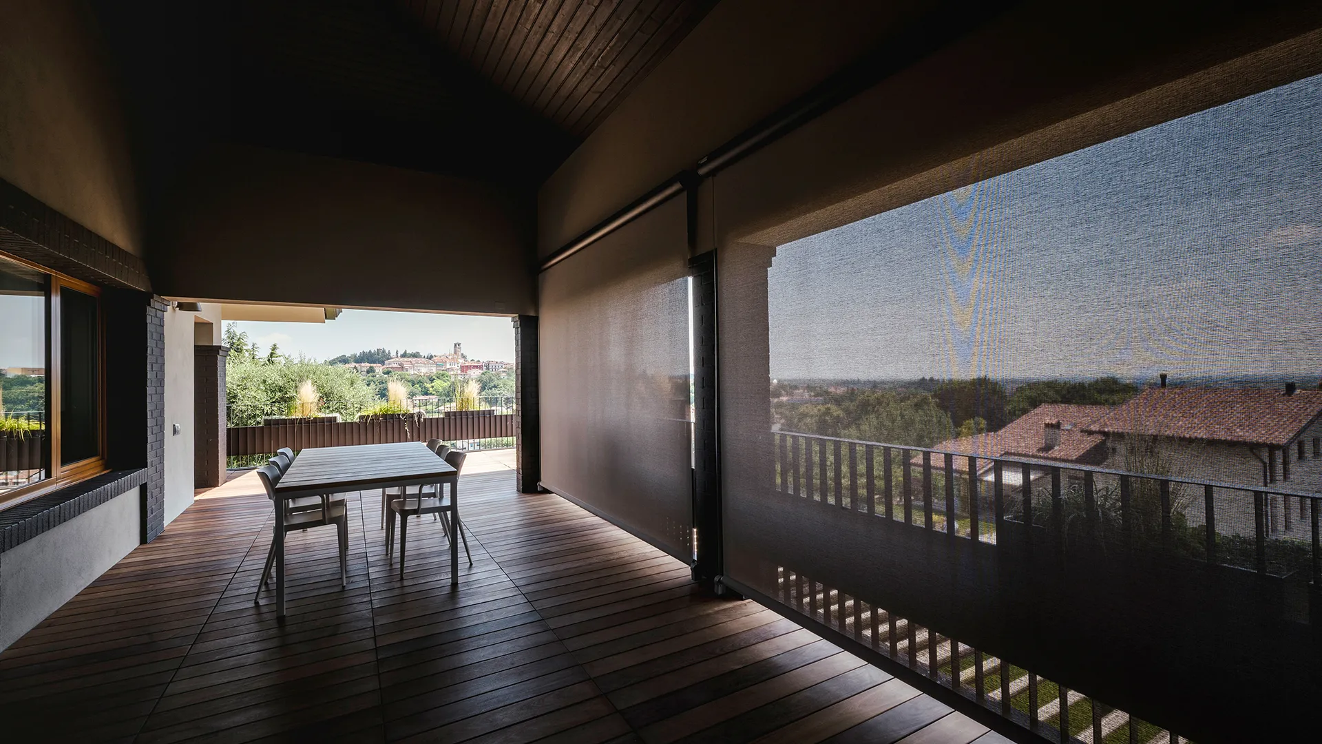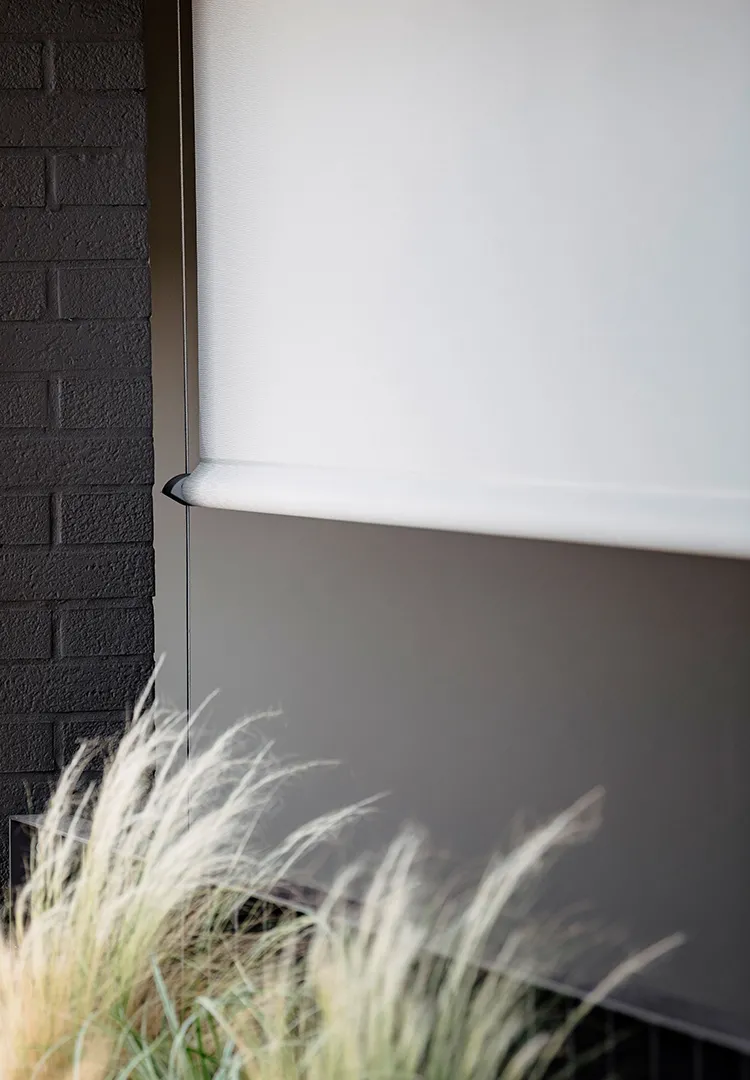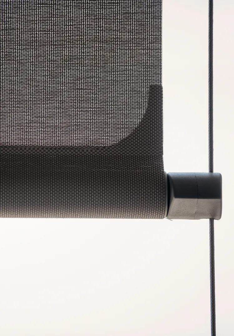 Il cassonetto compatto e verniciato in tonalità Cioccolato Dark, riprende le cromie della facciata, mentre le guide laterali in acciaio definiscono con precisione geometrica il perimetro della tenda. Il tessuto microforato Veozip Natural offre infine il giusto equilibrio tra ombreggiatura e trasparenza, permettendo alla luce di filtrare e mantenendo il contatto visivo con l’esterno.